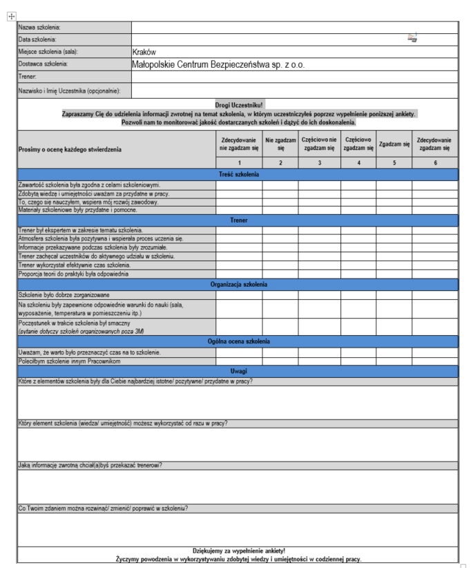 Zapraszamy Cię do udzielenia informacji zwrotnej na temat szkolenia, w którym uczestniczyłeś poprzez wypełnienie poniższej ankiety. Pozwoli nam to monitorować jakość dostarczanych szkoleń i dążyć do ich doskonalenia.